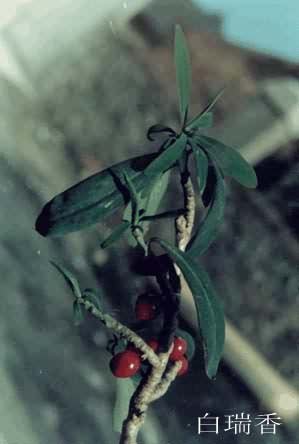 原形态白瑞香 常绿灌木,高1-1.5m,稀达4m。枝灰色至灰褐色,稀淡紫褐色,无毛。叶互生,纸质;长圆形至披针形,偶有长圆状倒披针形,长6-16cm,宽1.2-4cm,先端渐尖,基部楔形,两面均无毛。花白色,无芳香,数朵集生枝顶,近于头状,苞片外侧有绢状毛;总花梗短,密被短柔毛;花被筒状,长约16mm,被淡黄色短柔毛,裂片4,卵形或长圆形,长约5mm;雄蕊8,2轮排列,分别着生花被筒上部及中部;花盘环状,边缘波状;子房长圆状,长3-4mm,无毛。核果卵状球形。