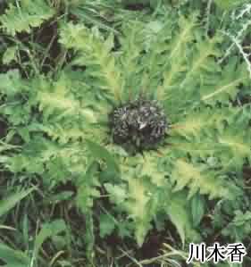 原形态1.川木香 多年生草本。主根圆柱形,直径1-2cm,外皮褐色,少有分枝。几无茎。叶基生,叶莲座状平铺地面;叶柄长8-20cm,被白色茸毛;叶片卵形、长圆状披针形或椭圆形,长12-30cm,宽8-20cm,羽状中裂或浅裂,少有不分裂,裂片5-7对,卵状披针形,边缘有锯齿,基部有小裂片,两面被糙估毛,下面疏生蛛丝毛和遥点。头状花序6-8密集;总苞宽钟形,直径6cm,总苞片6层,全部苞片质地坚硬,先端尾状渐尖成针刺状,边缘有稀疏的缘毛;花筒状,花冠紫色,长35-40mm,檐部长1cm,5裂,花冠裂片长6mm,细管部长3cm;雄蕊5,花药箭形,先端有长尾,子房下位。瘦果圆柱形,有宿厚冠毛;冠毛刚毛状,向上渐细,淡棕黄色,外层向下皱曲反折包围并紧贴瘦果,内层直立。花果期7-10月。